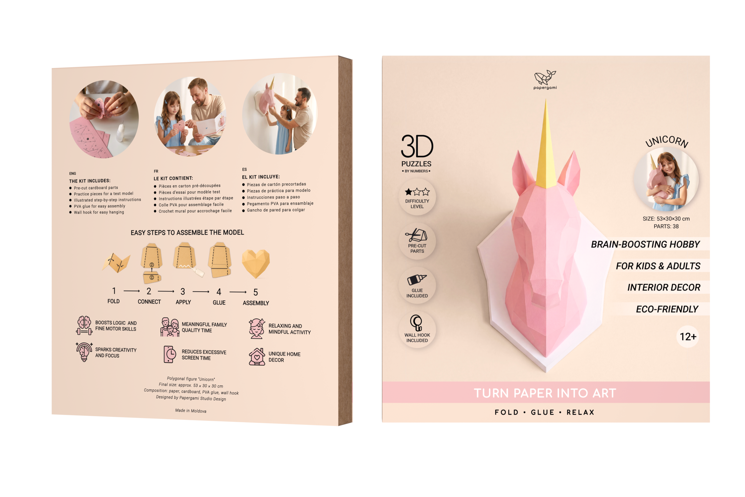 Acest kit DIY papercraft îți permite să creezi un unicorn 3D din hârtie, pas cu pas, într-un proces creativ, calm și plin de imaginație.